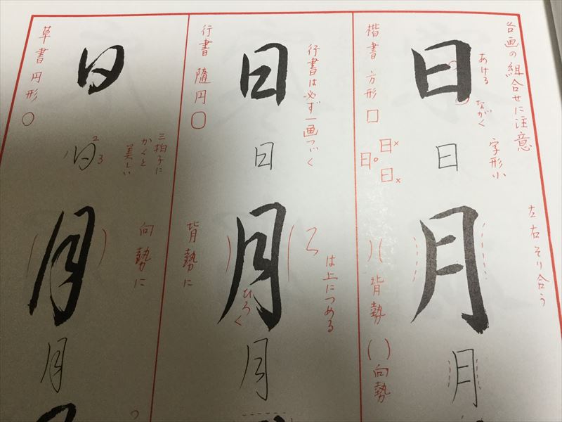 毛筆で書かれた下に、骨書きというかペン字でも書かれており、千字の三体すべてに赤字でポイントが示されているのです。わかりにくい文字には筆順も書いてくださっています。