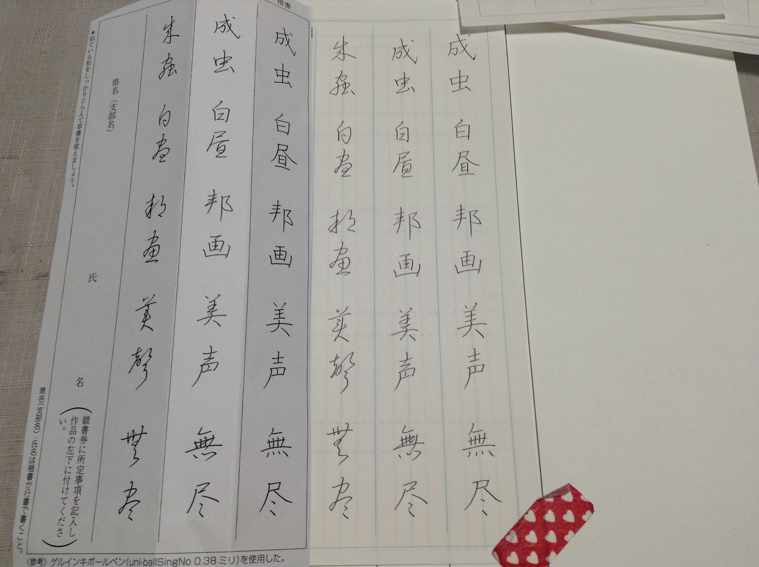 ちなみにこれはSigno 0.28ミリで書きました。お手本はSigno 0.38ミリですが、なんか太くて…。つけペンが一番強弱がきれいに出ますが、家でないと練習できないし、日常生活で使いません。なので、規定部はつけペンと決めてますが、他の部はだいたいお手本どおりの筆記具で書いています。