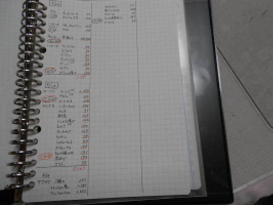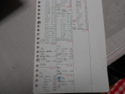 インスタやNAVERのまとめを参考に、早速まねっこ。A5方眼ルーズリーフを4列に分け、支出をどんどん書いて行きます。