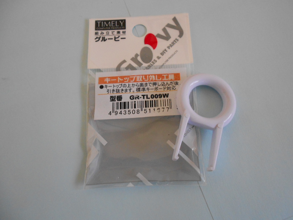 ドライバーなどでもできるようですが、専用の工具を買いました。これは250円でした。ぐっとキーのすきまに差し込んで輪っかに手をいれ引き抜きます。キーの配列を忘れると困るので