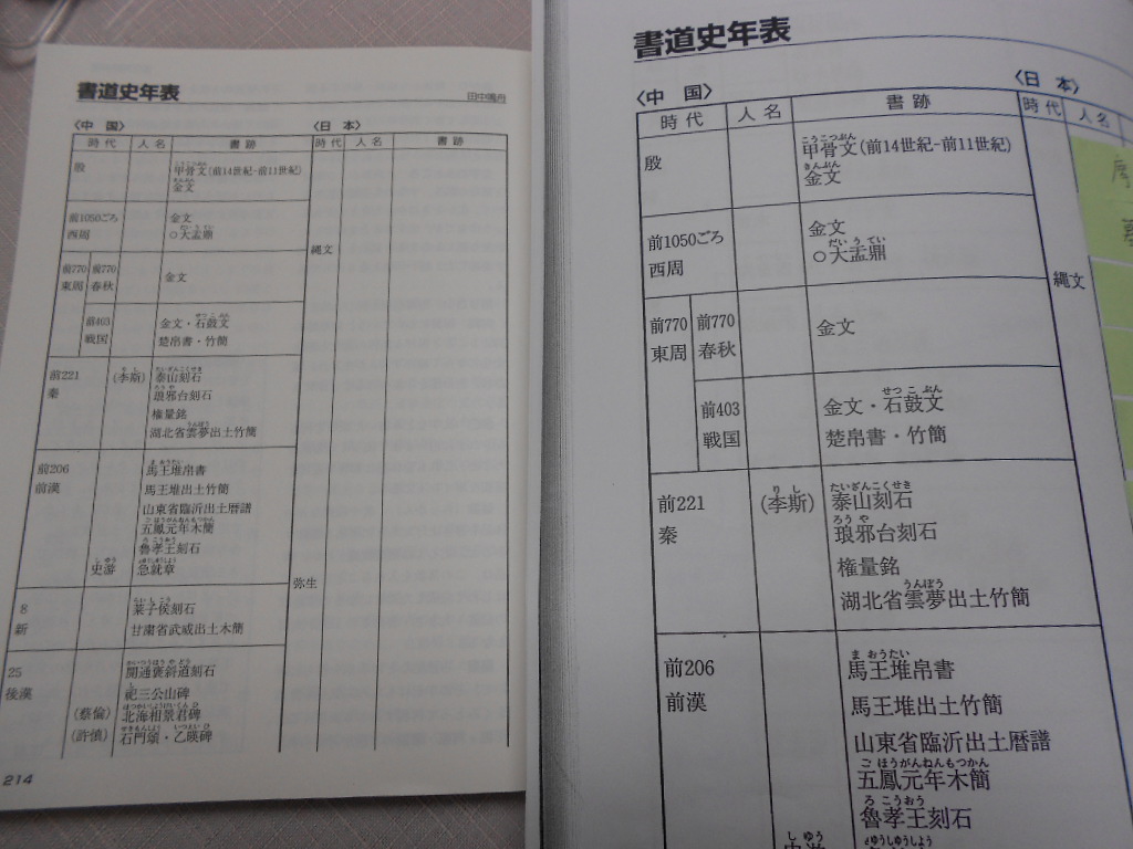 左が元サイズ。見開きB5サイズなので見開きB4に拡大コピー。中国と日本を並べて時代・人名・書跡がまとめてあってわかりやすいです。